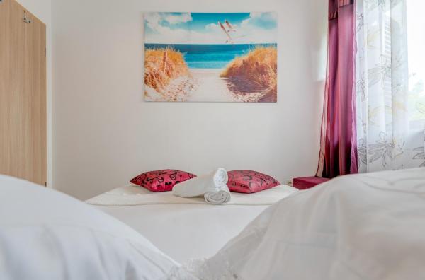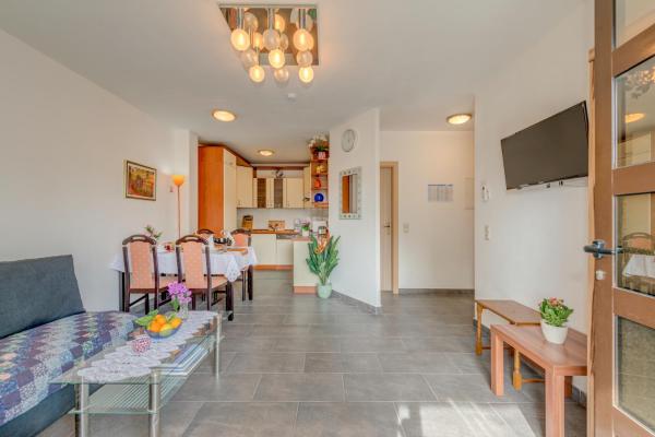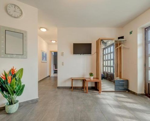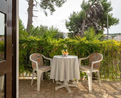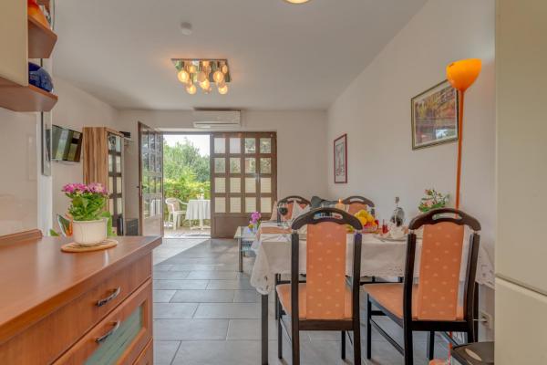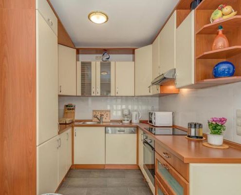 The house itself is situated in a quiet spot. The air-conditioned apartment is positioned on the ground floor, in front of it, there is a small terrace where you can sit outside and enjoy. There is also a parking place for your car. The apartment has a fully equipped kitchen with affiliated living quarters and dining area, a bathroom with a shower and two bedrooms with full-sized beds. In the living room stands a sofa-bed which allows up to two more persons to sleep there. It also has television, stereo and DVD-player. Furthermore, you have a washing machine at your disposal.