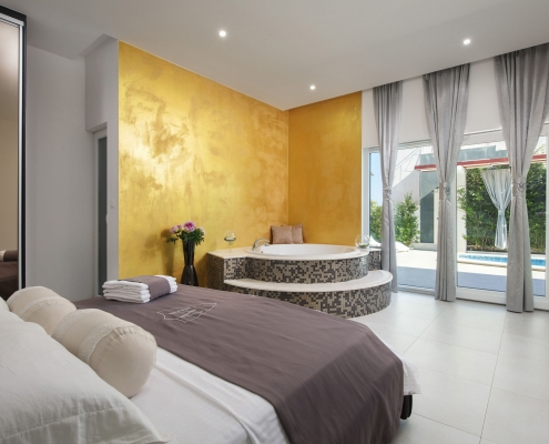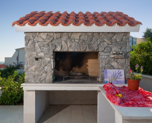 In addition, a kitchen / dining area is on guest’s disposal. It’s an area connected to the villa, but with a separate entrance. The area is a tavern type with an indoor fireplace and a fully equipped kitchen, and a separate toilet. Furthermore, the villa is equipped with an outdoor fireplace with a barbeque. Facilities on the ground floor are suitable for disabled people. The shower is a walk-in type.