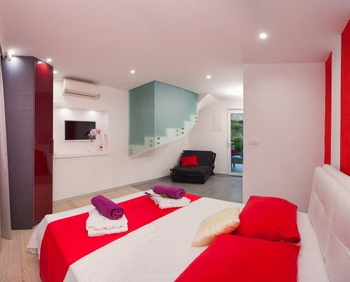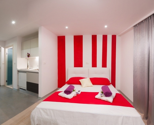 The third apartment (40 m2), located on the first floor with a separate entrance, is a studio apartment which comprises a double bedroom (a bed size 160 x 200 cm), a sitting room area with a kitchenette and a separate bathroom with shower. There is also a single folding bed.