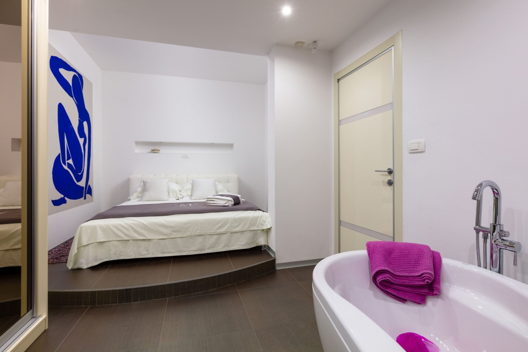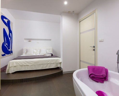 The fourth apartment (100 m2), which stretches over two floors (first and gallery), has a large sitting room, dressing room, double bedroom (a bed size 160 x 200 cm), bathroom and a kitchen on the first level. The upper floor is a gallery with twin beds (beds size 90 x 200 cm) and a private bathroom.